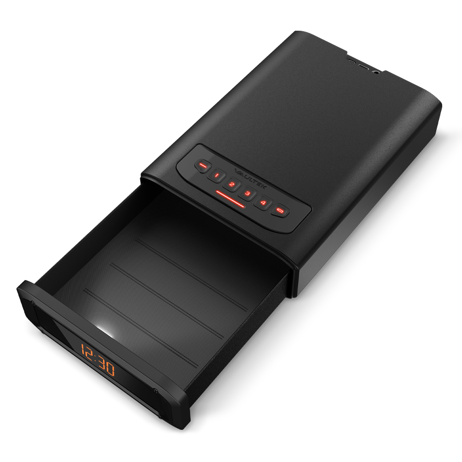 Vereinfachtes Design mit USB/USB-C-Ladeanschlüssen auf der Rückseite und einer stilvollen, funktionalen Uhr auf der Vorderseite. Das flache Design fügt sich nahtlos in jede Umgebung ein, ideal für Wohnmobile oder Nachttische. Die automatisch öffnende Schublade bietet Platz für eine Pistole in voller Größe (bis zu 22,86 cm), Schmuck, kleine Dokumente und andere persönliche Gegenstände. Das Präzisions-Kugellager-Zweischienensystem sorgt für eine schnelle, sanfte und leise Öffnung, während das eingebaute LED-Innenlicht den Innenraum beleuchtet.