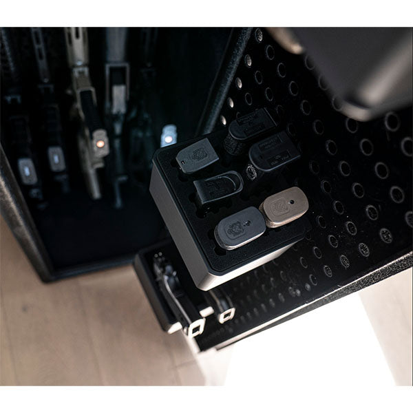 Das Handgun Magazine Rack von VAULTEK ist aus hochdichtem Schaumstoff gefertigt und bietet Platz für 6 Ersatzmagazine für Handfeuerwaffen. Das magnetische Konzept lässt sich bei Bedarf leicht neu positionieren. Für die optionale Türmontage ist die separat erhältliche Front Door Accessory Mount erforderlich. Das Handgun Magazine Rack ist mit allen RS Safe Modellen kompatibel.