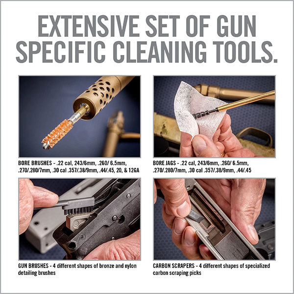 - Bürsten für .243 Kaliber/6,5 mm, .270/.280 Kaliber/7 mm, .30 Kaliber, .357 Kaliber/9 mm, .40 Kaliber, .45 Kaliber, 20GA, 12GA