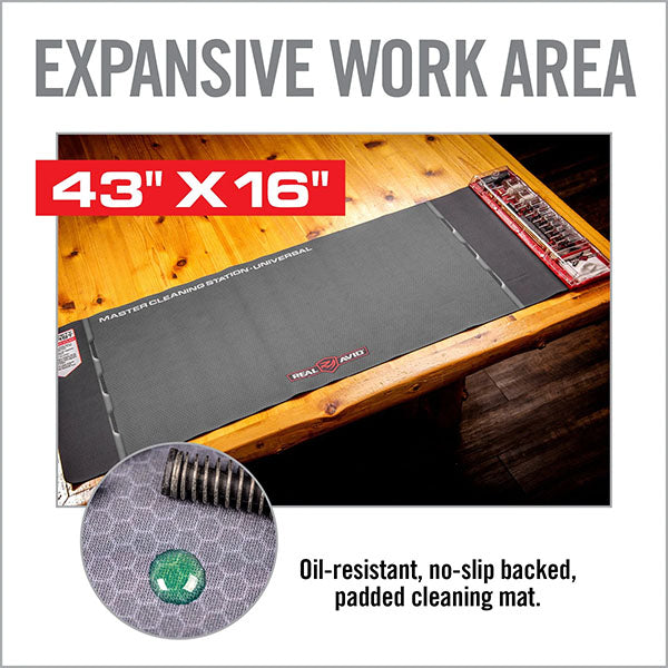 Vereinfache die Reinigung mit dem weltweit ersten UNIVERSAL MASTER CLEANING STATION Reinigungsset von REAL AVID. Entwickelt für eine umfassende Reinigung von Handfeuerwaffen. Sie kombiniert eine Next-Gen-Reinigungsmatte mit einem intelligent gestalteten Reinigungsset, das mit einem umfangreichen Satz von Reinigungswerkzeugen gefüllt ist. Es bietet Anleitungen zur Reinigung und Wartung und hält Waffenteile, die leicht zu verlieren sind, während der Arbeit organisiert. Das Reinigungsset bietet eine grosse Arbeitsfläche für eine vollständig zerlegte Waffe und lässt sich gleichzeitig für platzsparende Aufbewahrung in der mitgelieferten Tasche aufrollen.