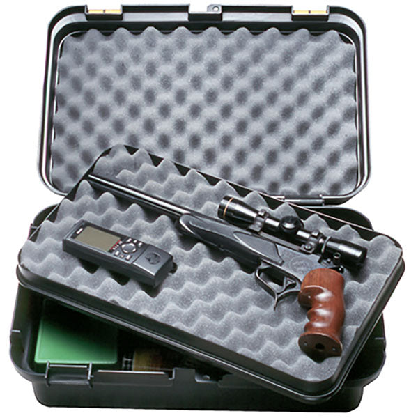 Dieser grosse Waffenbox wurde speziell für Sportler entwickelt und eignet sich für fast alle Arten von Handfeuerwaffen. Gegenstände von bis zu 7.6cm Breite können zwischen einem dicken Schaumstoff-Pad für möglichst sicheren und sorgenfreien Transport eingebettet werden. Das grosse, 47 x 26.7cm herausnehmbare Fach hat zwei Höhenpositionen. Der Boden der Waffenbox ist geräumig genug, um die gesamte Schiessausrüstung aufzunehmen, die Du auf dem Schiessstand benötigst. Ein grosser, stabiler Griff sorgt für den bequemen Transport und die Verschlusslasche ist für ein standardmässige Master Lock-Kombinationsschloss ausgelegt.